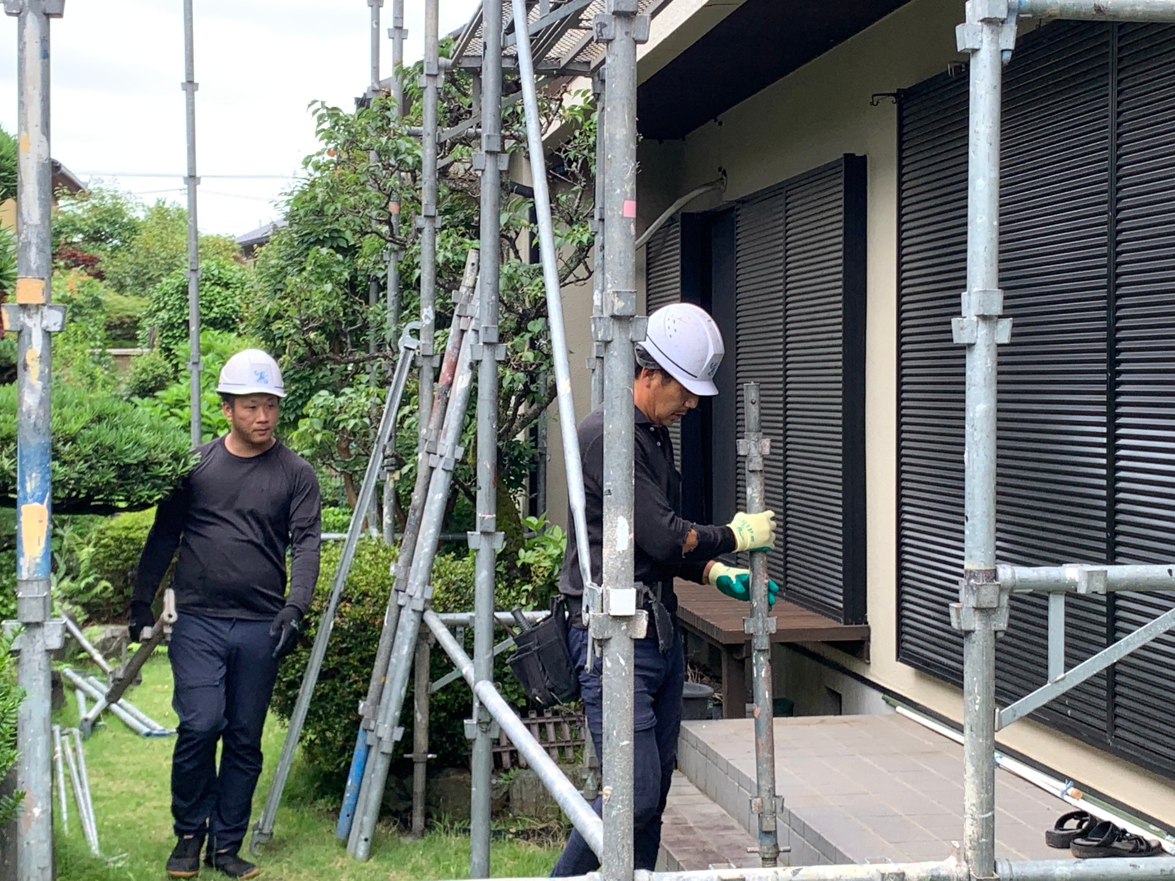 足場設置を行います。職人が安全に作業できるよう、建物全体にしっかりとした足場を組み立てます。足場の設置と解体にはそれぞれ半日ほどお時間をいただく場合があり、作業中は金属音が発生することがあります。事前に近隣の皆様へご挨拶を行い、ご理解とご協力をお願いしながら作業を進めています。