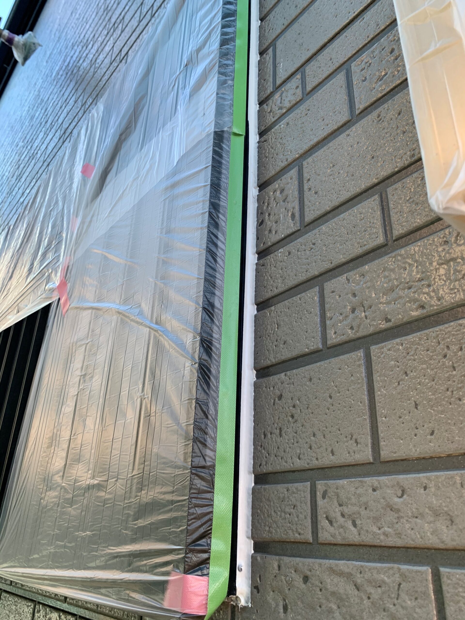 窓やドア、塗装しない部分をビニールなどで丁寧に覆い、養生を行います。養生は塗料の飛散を防ぎ、建物や周囲を汚さないための大切な工程です。仕上がりの美しさにも関わる作業のため、細かな部分まで丁寧に確認しながら進めています。